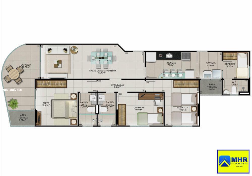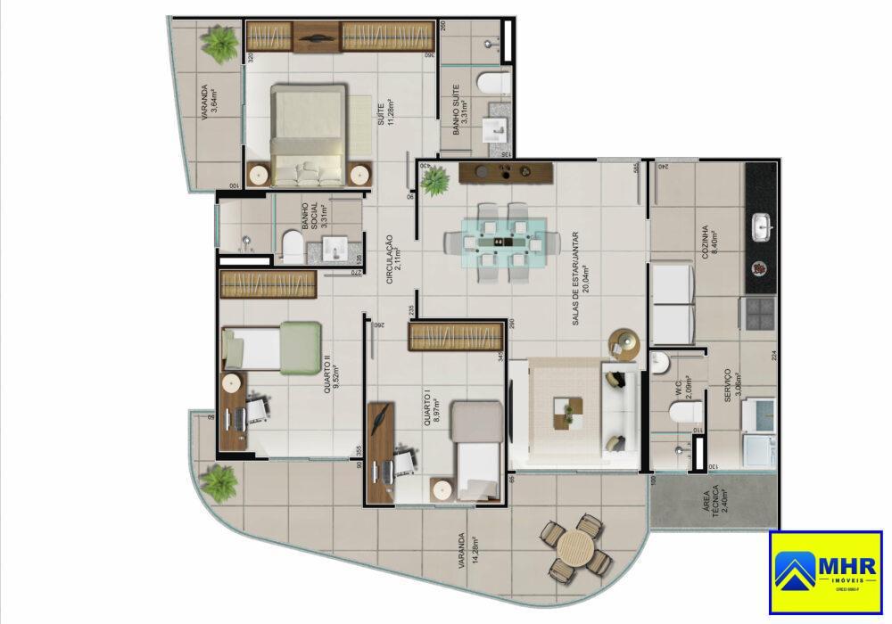 Com uma planta inteligente, cada apartamento possui 03 quartos com suíte, oferecendo o espaço ideal para acomodar sua família com comodidade. As áreas privativas variam de 102,28m² a 106,21m², proporcionando um ambiente amplo e aconchegante.